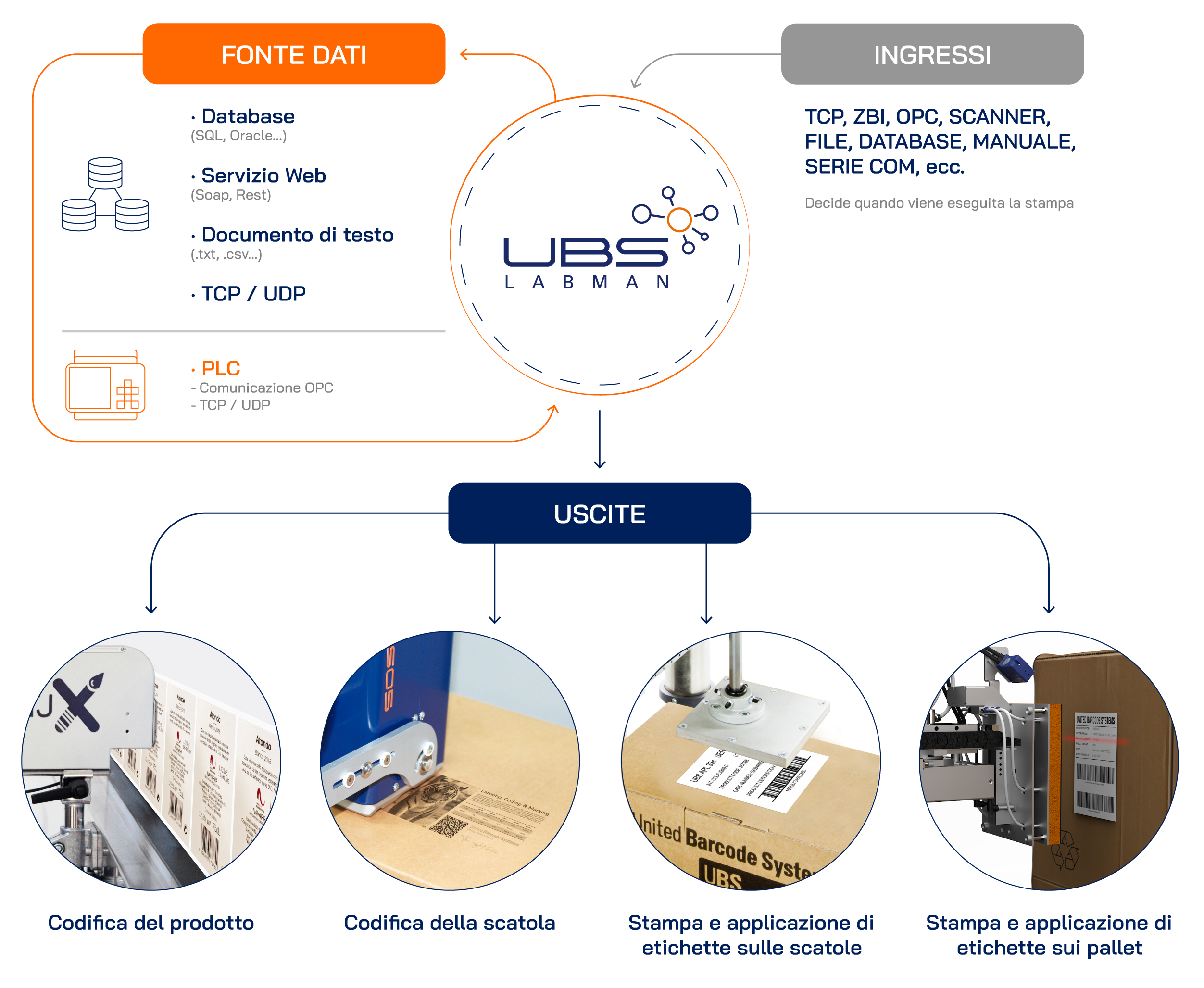 UBS LABMAN consente di identificare i prodotti di diverse linee, di gestire le code di stampa e di integrare i dati con l'ERP/MES del cliente, generando etichette logistiche complete per lo stoccaggio, il trasporto e la tracciabilità, conformi agli standard GS1 International.